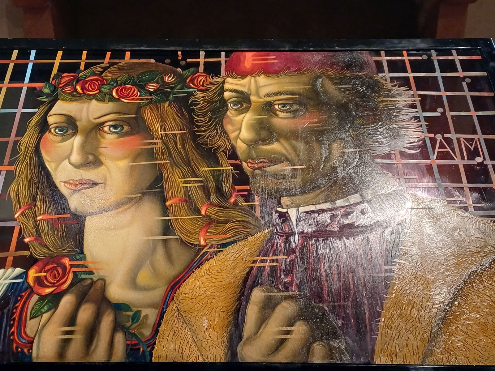 Per questa sua presenza espositiva nella Casa del Mantegna Alfonso Leto ha “dato vita” ai ritratti immaginari di Andrea Mantegna e della sua prima moglie Nicolosia Bellini (proveniente da una delle famiglie di artisti più importanti del Rinascimento italiano, strettamente relazionata con la formazione veneta di Andrea), in una doppia versione. “Immaginare oggi, sei secoli dopo (- scrive l’artista in una nota in catalogo -) una possibile fisiognomica di una delle coppie più iconiche del Rinascimento è un desiderio connaturato al gesto pittorico (mitologico-affettivo): un esercizio quasi medianico, da cui nascono due volti rinascimentali e cyborg dipinti su supporti estratti da schermi televisivi, come gran parte delle opere di questa mostra”.